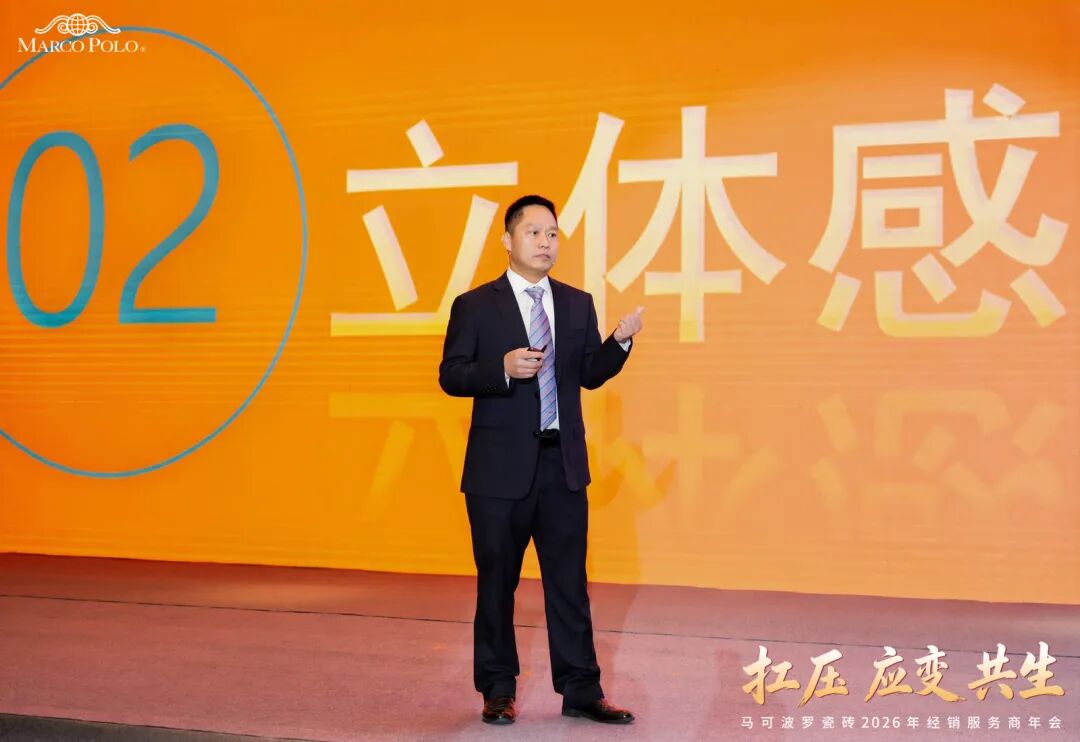 马可波罗控股营销中心副总经理黄焱斌对2026年新品进行品鉴解读,并详细讲解了新品的营销政策。