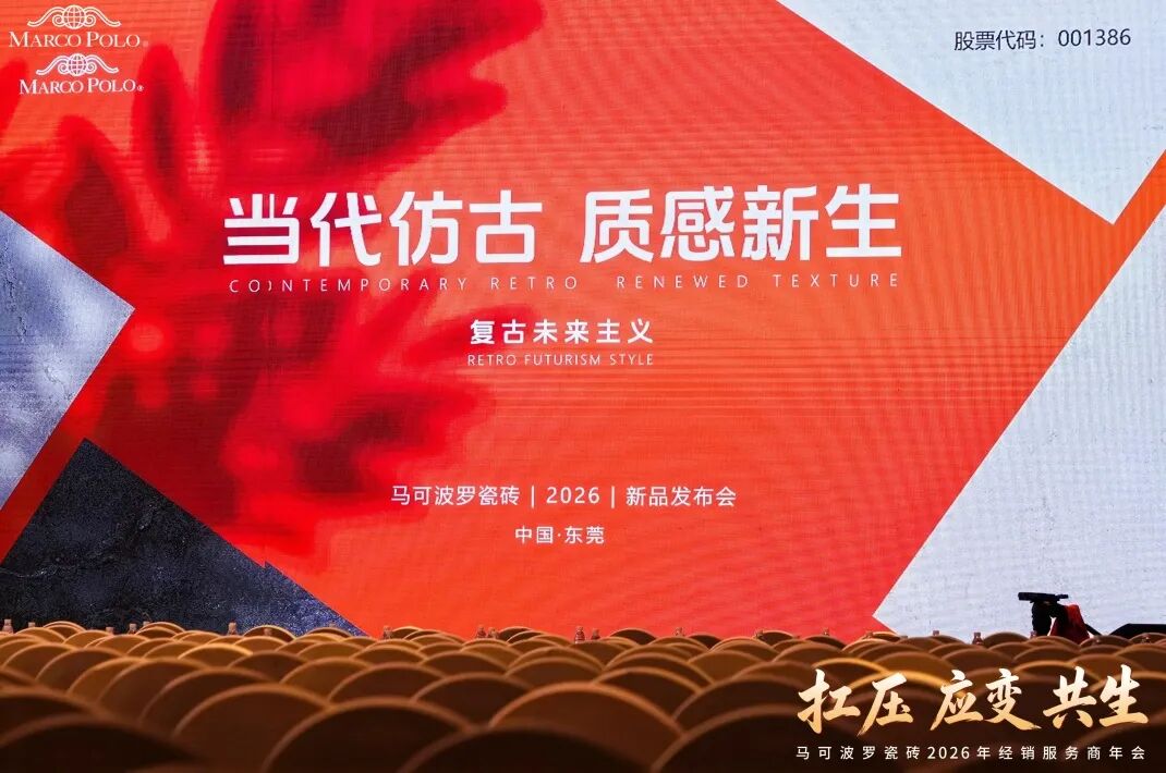 年会期间,马可波罗瓷砖2026年新品发布会同步举行,正式推出以“当代仿古 质感新生”为主题的年度新品。秉持“美化人类生活”的使命,马可波罗2026年新品巧妙融合经典美学与当代设计语言,全面升级产品的光感、色彩、透感、触感与立体感,带来多维度的感官焕新体验,让复古韵味在当代空间中焕发真实、细腻且富有生命力的质感表达。