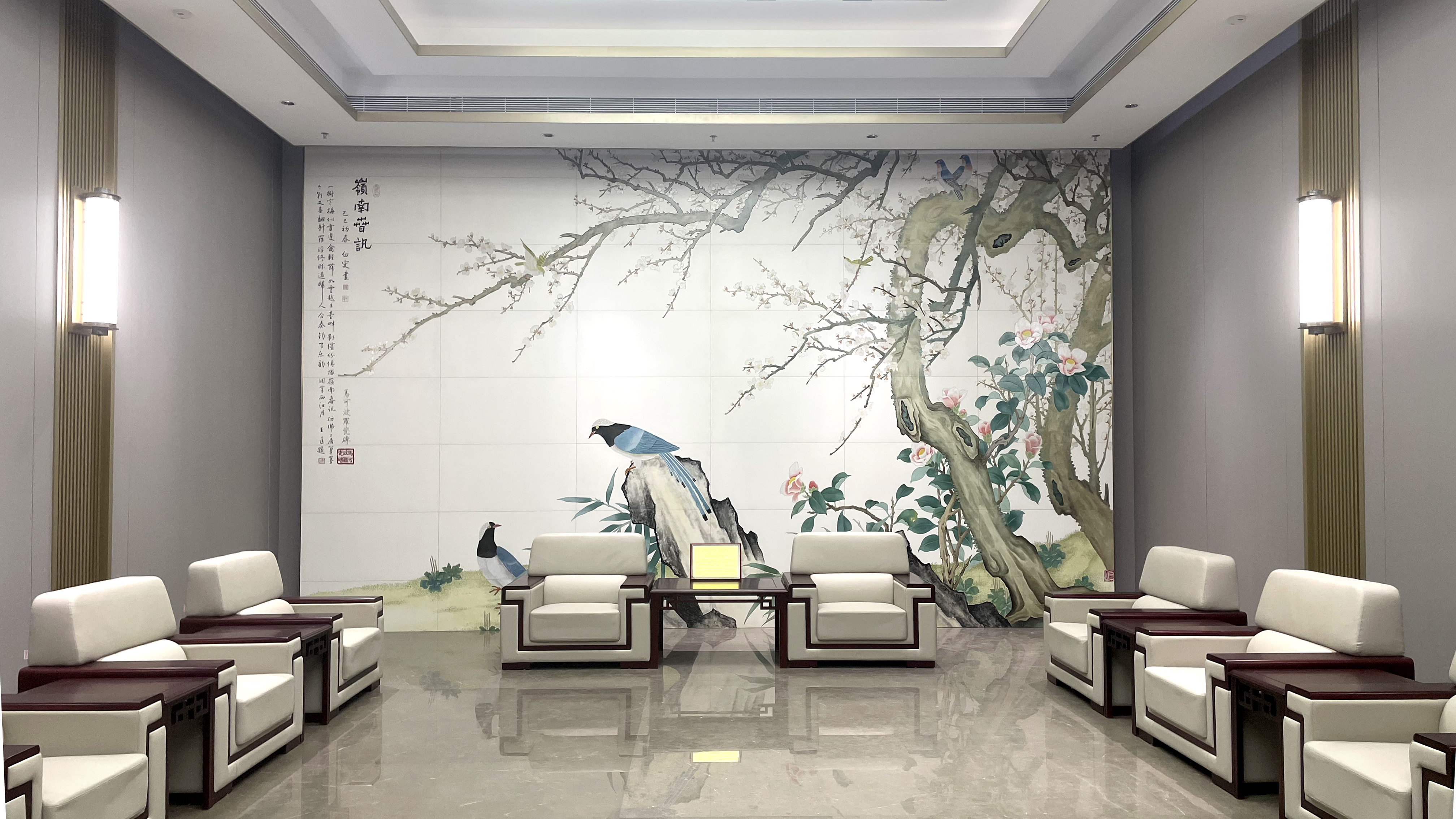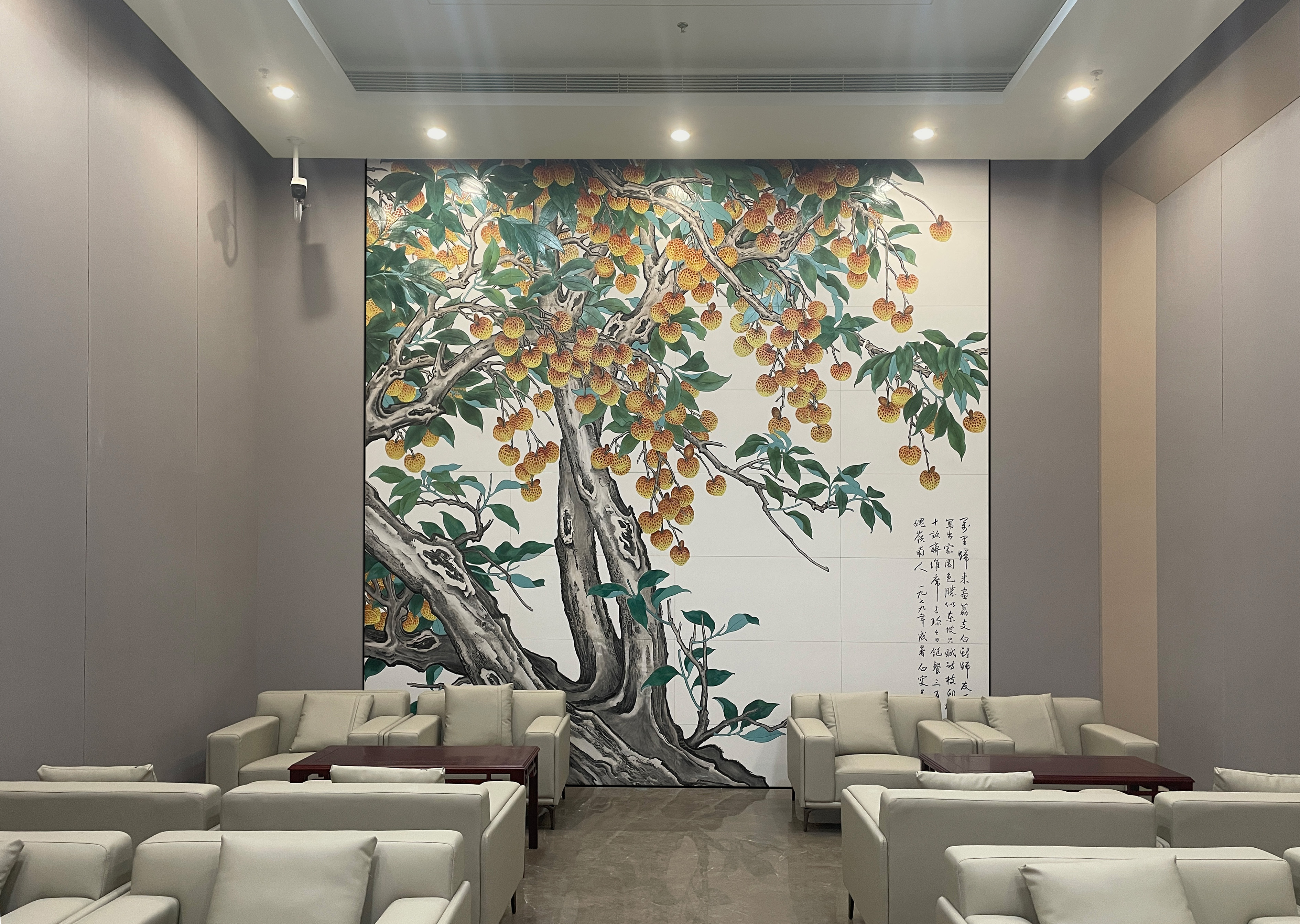 虎门高铁站VIP候车室壁画项目由东莞市委宣传部牵头,东莞市文广旅体局、岭南美术馆、可园博物馆、东莞市博物馆共同参与策划,最终确定应用中国当代著名工艺美术教育家、陶瓷艺术家、工笔花鸟画家邓白先生的代表作纸本《岭南春讯》、《岭南丹荔》为蓝本,由马可波罗控股唯美文化陶瓷负责二次创作转化为陶瓷艺术壁画。
