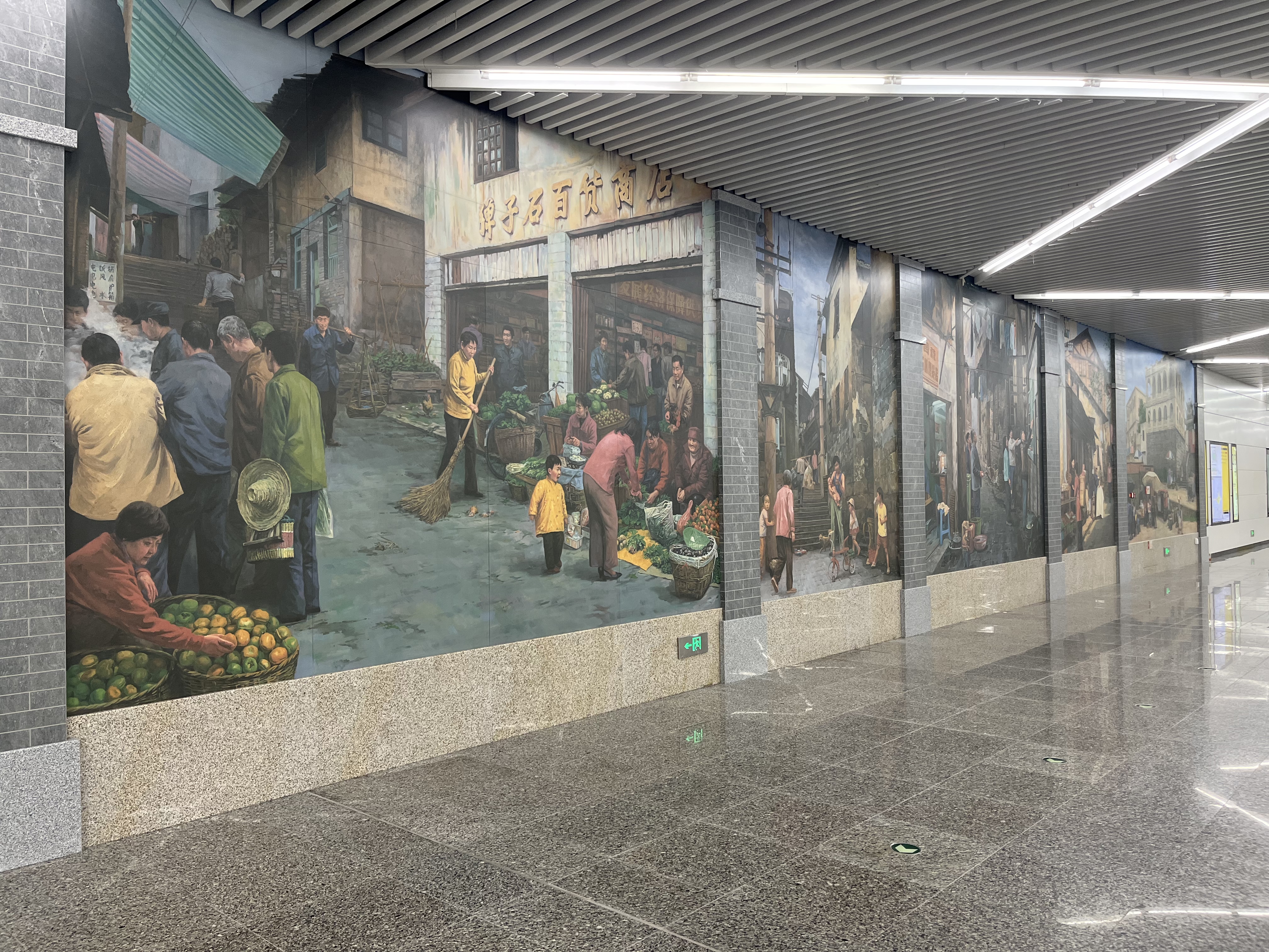 其中大礼堂站陶瓷艺术壁画《礼赞新时代》以岩彩青绿山水的艺术形式描绘了重庆的地标建筑和人文风情,贵气高雅、深邃透气,展现了重庆的城市魅力。作品入选2022年中国壁画作品展。