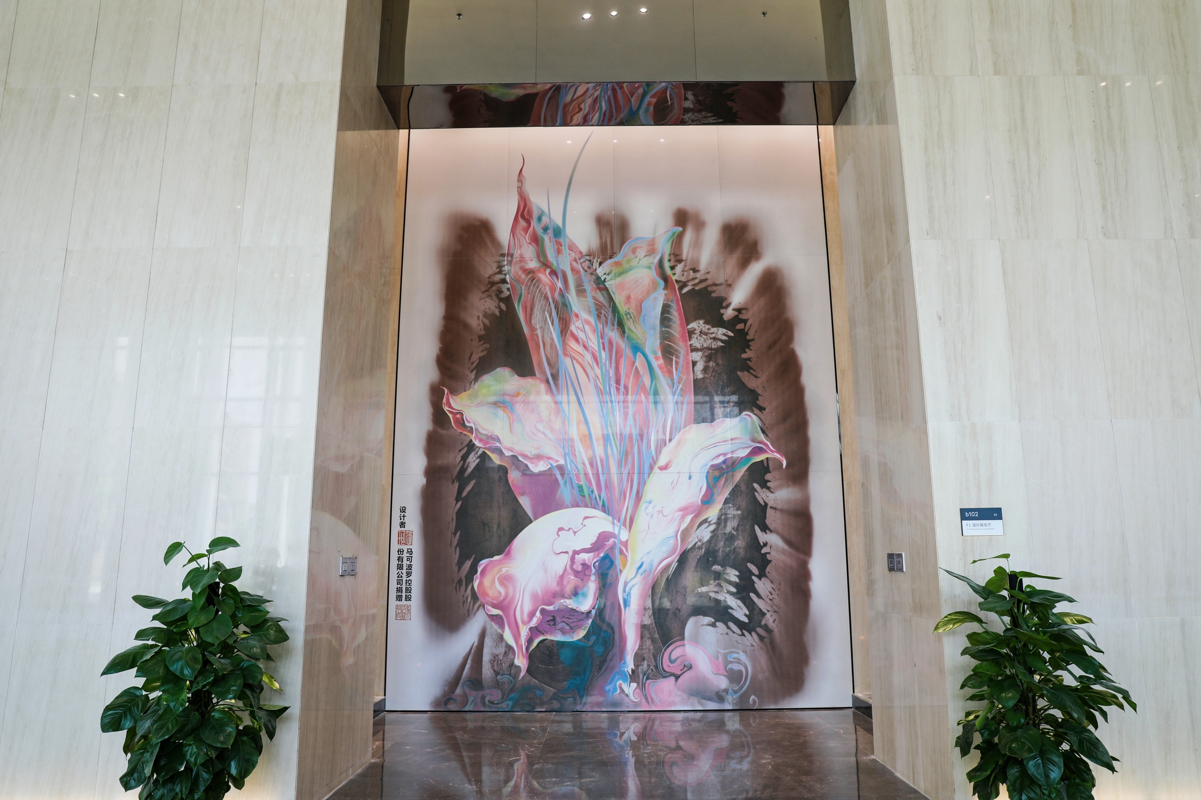 国际学术报告厅《木棉花》,由华南理工大学艺术学院张珂教授设计,马可波罗文化陶瓷团队制作而成。画面以华工校徽的“木棉花”为主题进行创作,以渗墨水印版画为基础,形成独特的艺术效果。