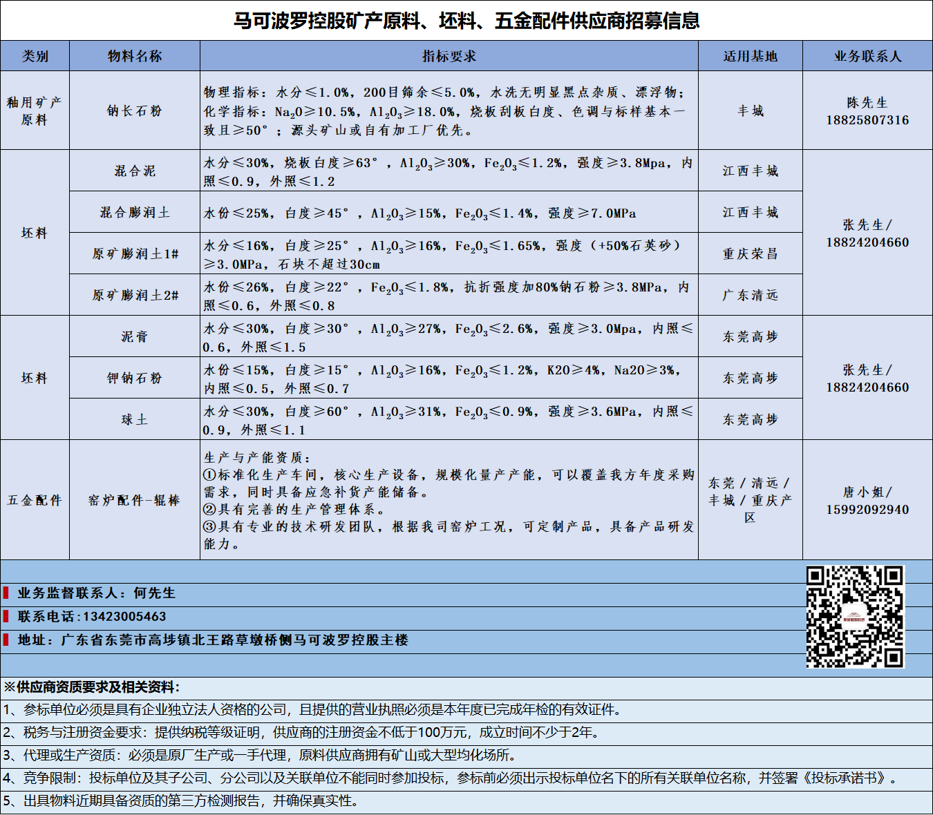 合作公告 马可波罗控股坯料、矿产化工产品供应商招募信息 马可波罗控股坯料、球石类、设备及窑炉材料供应商招募信息 马可波罗控股矿产原料、坯料、五金配件供应商招募信息 坯料、辅料及配件供应商招募信息 坯料供应商招募信息 化工色辅料供应商招募信息 化工辅料集采邀标公告 燃料集采邀标公告 原料集采邀标公告 配件及包材类集采邀标公告 坯料供应商招募信息 外包保洁服务招标书 集装箱招标函 招标采购 马可波罗控股矿产原料、坯料、五金配件供应商招募信息