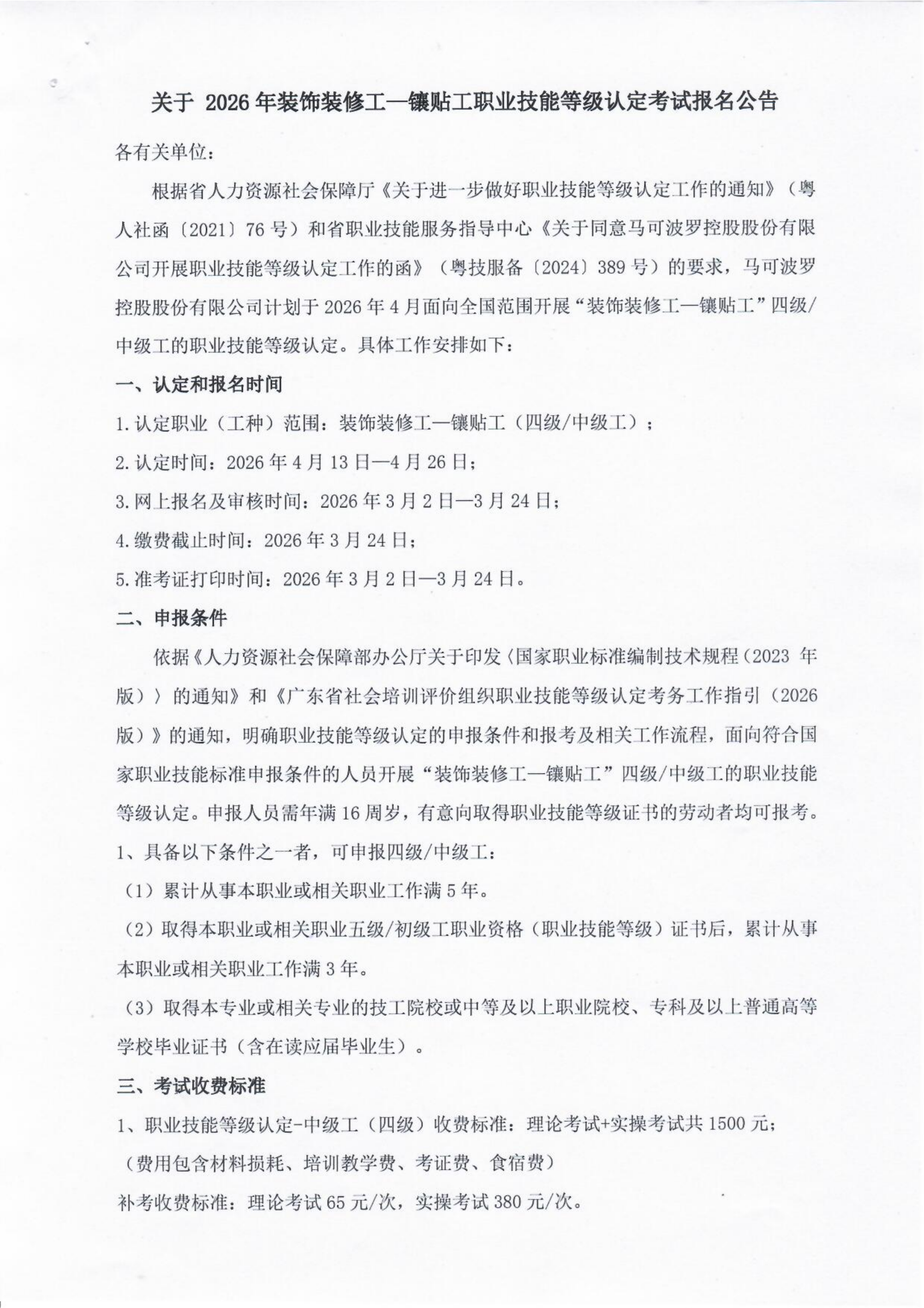 营业执照公示 2024年广东家美陶瓷有限公司社会责任报告 2023年广东家美陶瓷有限公司社会责任报告 关于 2025 年东莞市装修装饰工-镶贴工职业技能等级认定考试报名公告 马可波罗控股股份有限公司装饰装修工(镶贴工)职业技能等级认定评价结果公示 关于 2026 年东莞市装饰装修工-镶贴工职业技能等级认定考试报名公告 信息公示 关于 2026 年东莞市装饰装修工-镶贴工职业技能等级认定考试报名公告